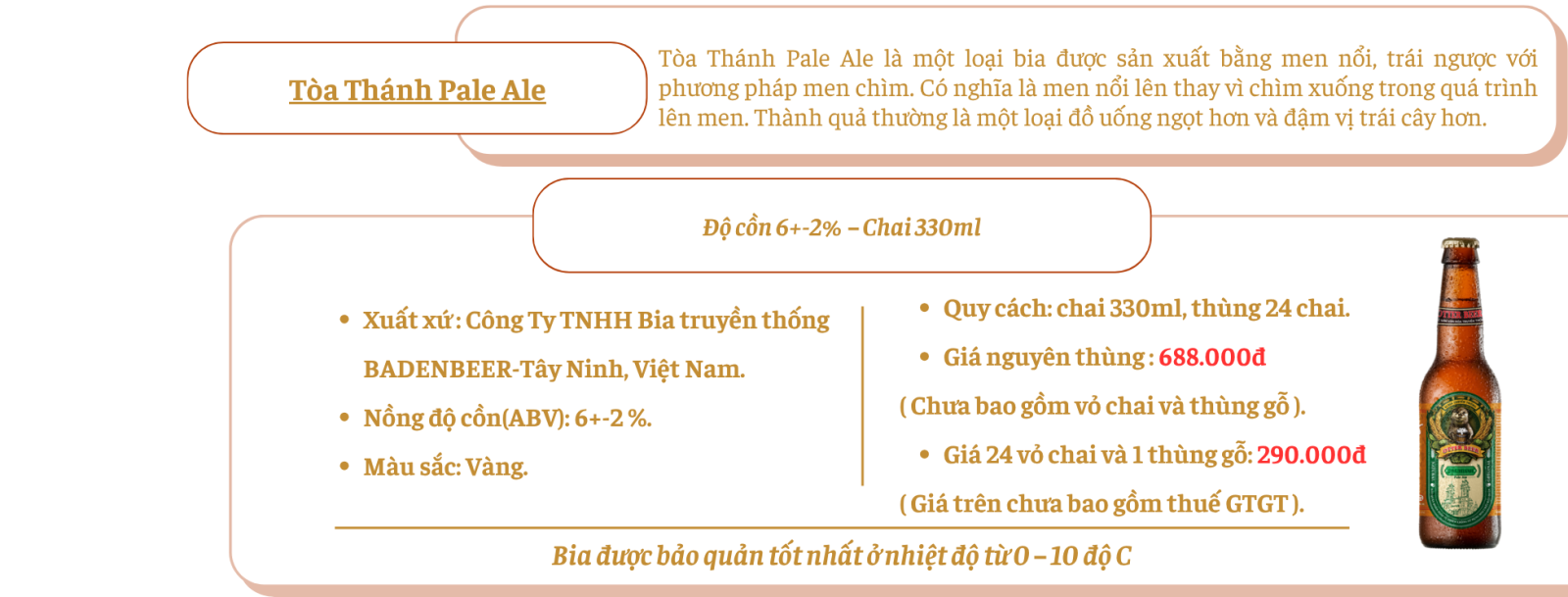 Mô tả Thành phần: Mạch nha Đại mạch + Hoa Bia nhập khẩu Mỹ & New Zealand + Men Bia + Nước + dịch trái cây tươi cô đặc 5 Hương vị: Men bia kết hợp với hoa bia cho hương vị đắng, chua nhẹ hòa lẫn, hương thơm thảo mộc kết hợp vị trái cây hòa lẫn vị ngọt thanh mát sảng khoái. Dòng bia Tòa Thánh pale ale: - Là đặc trưng của bia truyền thống OTTER BEER nên không trong suốt mà có chứa những tế bào men bia tự nhiên vì quá trình lên men lần 2 còn tiếp diễn trong chai - Tòa Thánh Pale Ale là một loại bia được sản xuất bằng men nổi, trái ngược với phương pháp men chìm. Có nghĩa là men nổi lên thay vì chìm xuống trong quá trình lên men. Thành quả thường là một loại đồ uống ngọt hơn và đậm vị trái cây hơn.