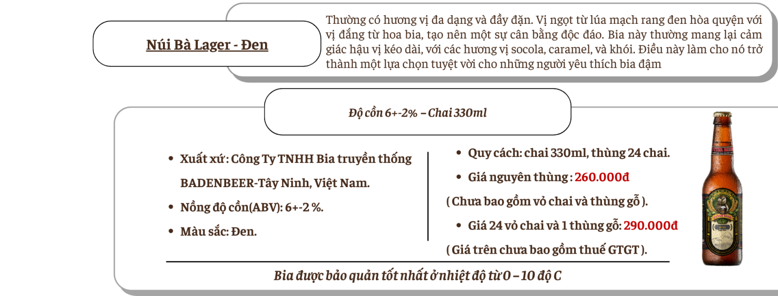 Mô tả: Thành phần: Đại mạch rang đen + Gạo + hoa bia + nước + men bia Hương vị: vị đắng nhẹ và mang đến hương vị khói, socola, caramel Dòng bia Núi Bà Lager - Đen: - Thường có hương vị đa dạng và đầy đặn. Vị ngọt từ lúa mạch rang đen hòa quyện với vị đắng từ hoa bia, tạo nên một sự cân bằng độc đáo. Bia này thường mang lại cảm giác hậu vị kéo dài, với các hương vị socola, caramel, và khói. Điều này làm cho nó trở thành một lựa chọn tuyệt vời cho những người yêu thích bia đậm