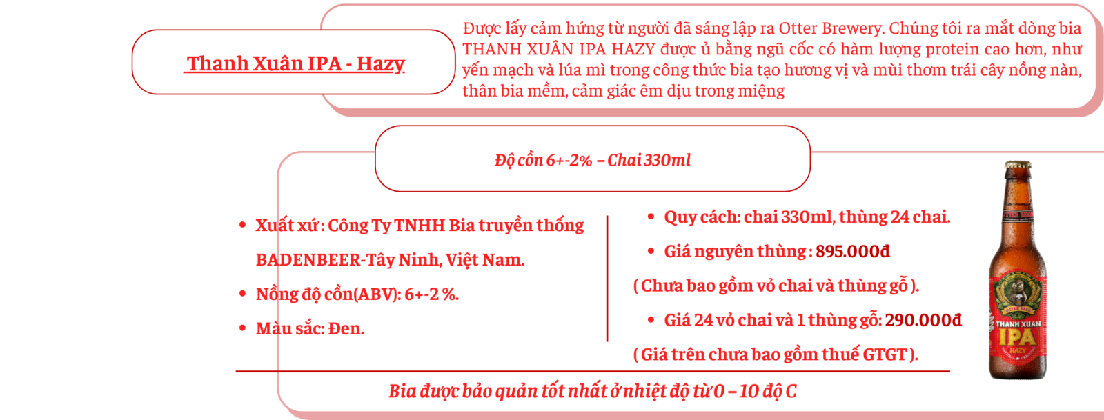Mô tả: Thành phần: Mạch nha Đại mạch - Yến mạch + 3 loại Hoa bia nhập Mỹ Citra, Mosaic, Simcoe + Nước + Men bia+ dịch nhiều loại trái cây tươi Hương vị: Vị trái cây nhiệt đới mọng nước có ga kết hợp cùng với vị đắng của mứt Cam sảng khoái, nồng nàn Dòng bia Thanh Xuân IPA - Hazy: Được lấy cảm hứng từ người đã sáng lập ra Otter Brewery. Chúng tôi ra mắt dòng bia THANH XUÂN IPA HAZY được ủ bằng ngũ cốc có hàm lượng protein cao hơn, như yến mạch và lúa mì trong công thức bia tạo hương vị và mùi thơm trái cây nồng nàn, thân bia mềm, cảm giác êm dịu trong miệng
