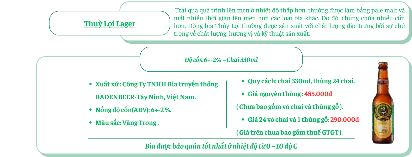 Mô tả Thành phần: Đại Mạch + Hoa Bia - Nước + Men bia Hương vị: Có màu vàng trong và hương vị thơm mát, sảng khoái, vị hoa bia sắc bén và nhẹ nhàng Dòng bia Thuỳ Lợi Lager - Trải qua quá trình lên men ở nhiệt độ thấp hơn, thường được làm bằng pale malt và mất nhiều thời gian lên men hơn các loại bia khác; do đó, chúng chứa nhiều cổn hơn, Dòng bia Thủy Lợi thường được sản xuất với chất lượng đặc trưng bởi sự chứ trọng về chất lượng, hương vị và kỹ thuật sản xuất